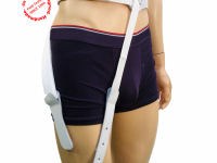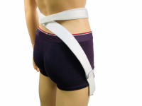 Establish the length of the hip belt and sew on large leather tab. Attach the leather tab to the socket in the region of the trochanter. Fit auxiliary strap so that the padded area is in a comfortable position over the hip. Sew the small leather tab on to the auxiliary strap and attach to socket with stud. Sew plain end of auxiliary strap to the hip belt at the height of the intersection of the lumbar vertebral column and sacrum.